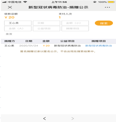 会计学院统计与会计核算专业,17统会4班姚铭艳同学,小善意,大温暖。向武汉市慈善总会的新型冠状病毒防控专项基金捐款。
