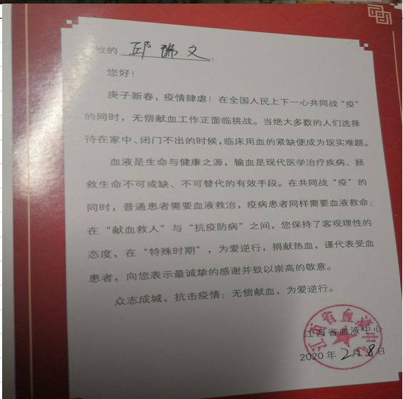 会计学院会计专业,19会计10班邱瑞文同学,用实际行动投入到这场“战疫中”,在“特殊时期”,为爱逆行,无偿献血。