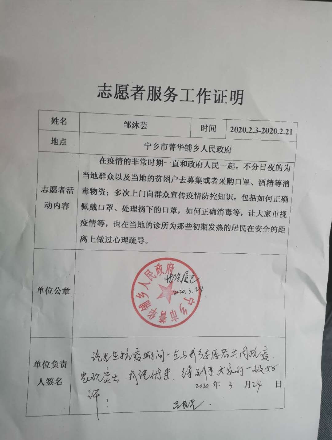 自新型冠状病毒疫情以来,邹沐芸便积极加入志愿者,用自己的实际行动去践行使命,在疫情面前勇往直前,跟政府人民共同帮助国家共渡难关。2月11日,她用自己在年前实习所得的200元工资,捐赠给需要的人。在2月3日到2月14日,把防控落到实处,加强宣传,不分日夜的为共产党员及当地的贫困户去募捐,去采购口罩、酒精等消毒物资。2月16日到2月19日,多次访问农村户口和他们进行交流,包括如何正确佩戴口罩、处理摘下的口罩,如何正确消毒,让大家重视疫情,认真落实防控责任。2月19日到2月21日,她在疫情面前没有退缩,在安全的距离上为当地的诊所为那些初期发热的居民做心理疏导。3月23日,疫情稳定后再次拜访之前的农村贫困户,让大家不要松懈。越是重要关口越见精神品质,越是关键时刻,越看担当作为。邹沐芸同学不畏艰险、迎难而上、勇于担当、用实际行动展现了青年形象,担当精神。