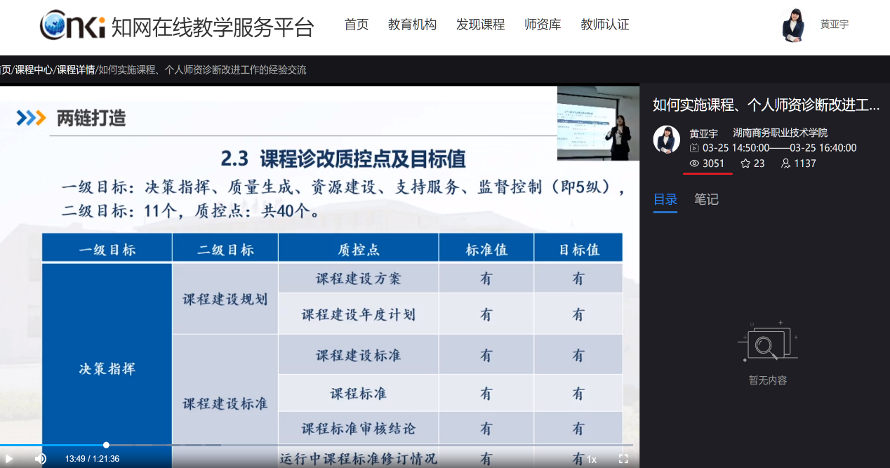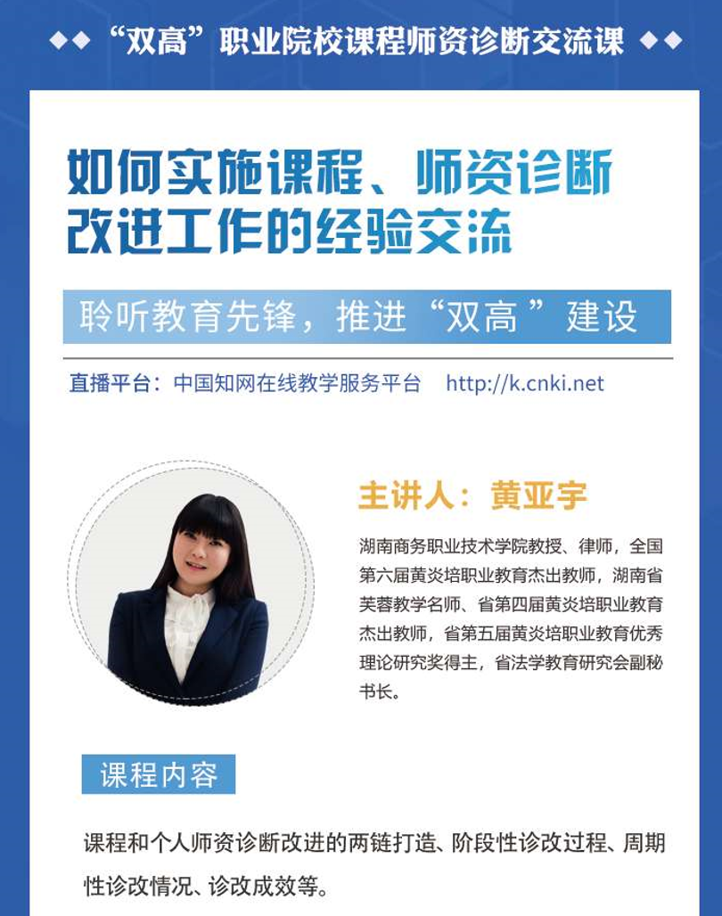 随着2020年湖南职业教育与成人教育工作要点的推出,黄教授发现“持续推进教学工作诊断与改进”是湖南省2020年职教工作的要点之一。于是,黄教授在朋友圈表达了计划进行公益直播,分享自己参加学校教学和师资诊断改进工作的一些经验的想法。第二天,中国知网湖南分公司就与其取得联系,双方商定于3月25日下午15点在知网在线教学服务平台推出公益直播课程《如何实施课程、师资诊断改进工作的经验交流》。
