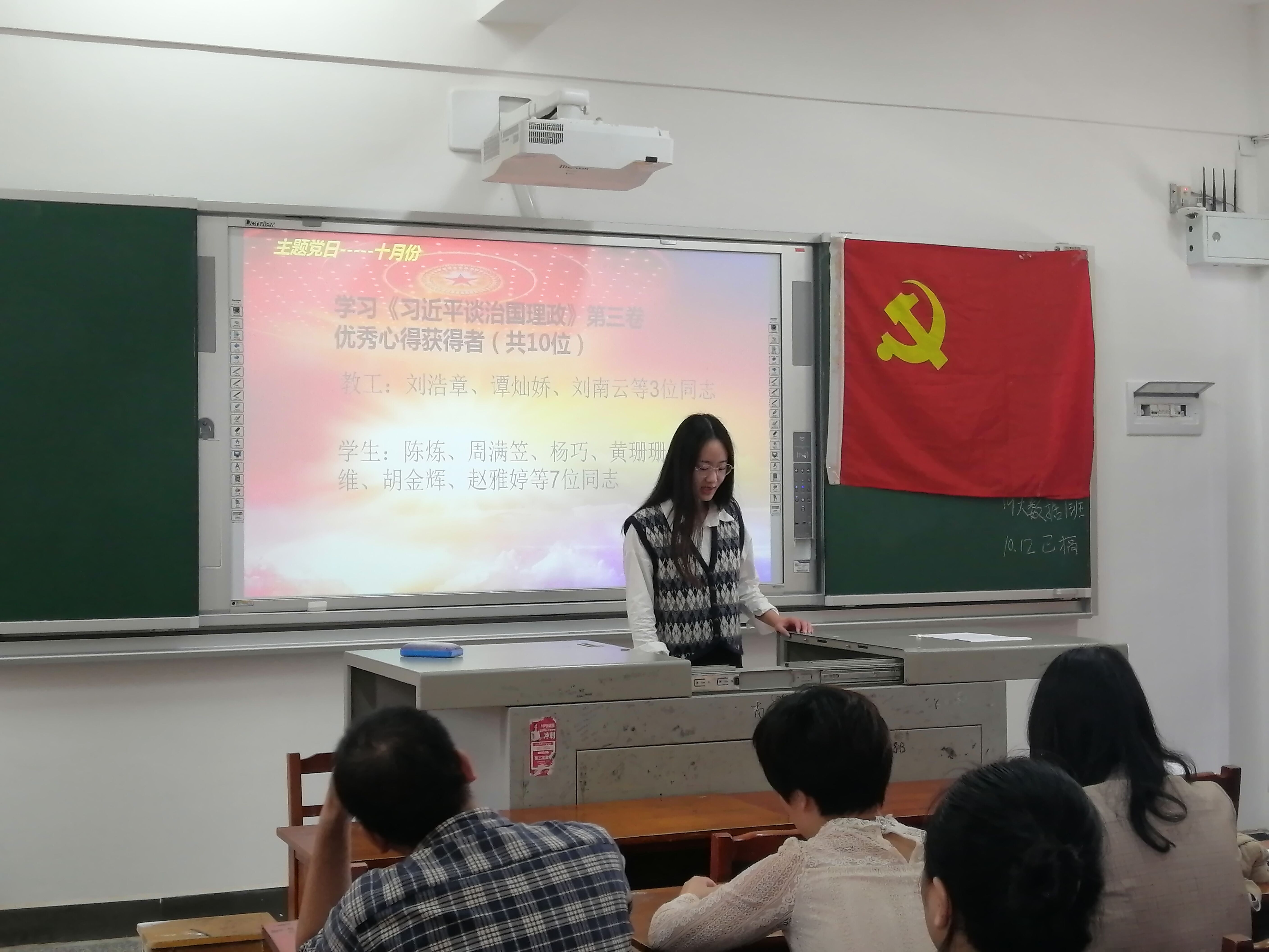 最后宣读表彰学习《习近平谈治国理政》(第三卷)优秀心得获得者名单(共10位):教工:刘浩章、谭灿娇、刘南云等3位同志;学生:陈炼、周满笠、杨巧、黄珊珊、曾维、胡金辉、赵雅婷等7位同志