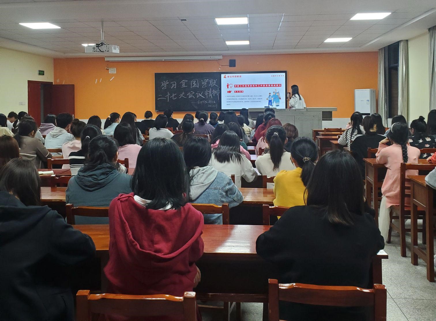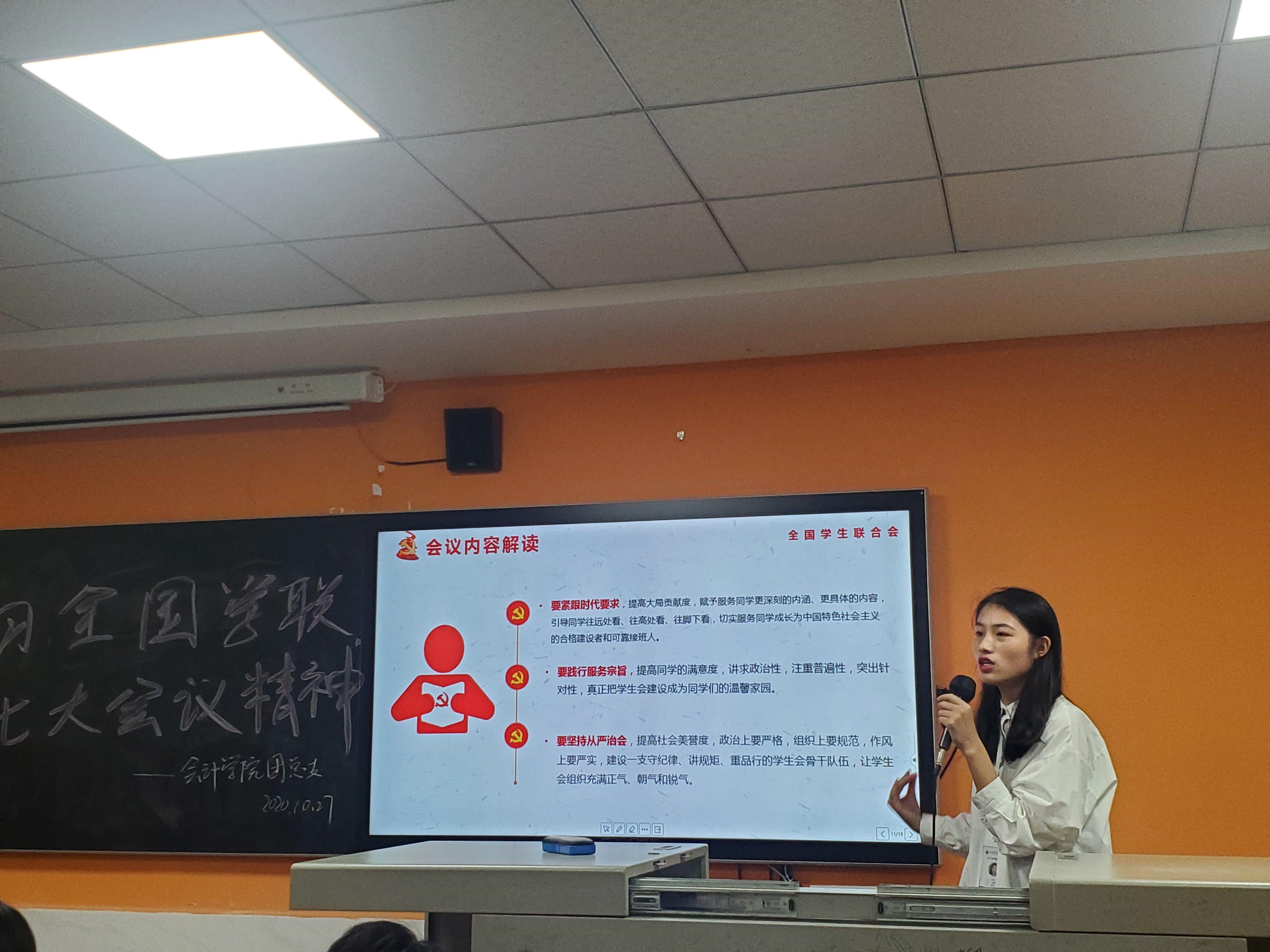 2020年10月27日晚上18:00,湖南商务职业技术学院会计学院宣传部和各级各班宣传委员于2教210室召开《学习全国学联二十七大会议精神》会议,本次会议由团总支副书记陈炼主讲。会议目的是为了更好地落实全国学联二十七大会议精神、为了认真学习宣传贯穿全国学联二十七大习近平同志贺信和党中央致词精神、为了提高我院学生干部综合素养,培育胸怀理想、心系同学、作风扎实的学生干部。