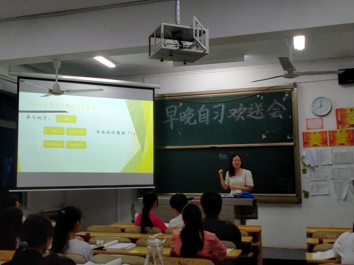 “提到早晚自习,你第一个想到的是什么呢?”谈到关于早晚自习的感受,同学们纷纷踊跃在黑板上写下了自己的想法。有的同学认为早晚自习给自己印象最深刻的就是“早起”,这让自己改掉了睡懒觉的毛病;有的同学感谢早晚自习,因为它让自己戒掉了“手机瘾”,专心学习;还有的同学表示,因为责任教室在六楼,提到早晚自习就想到了“爬楼梯”,这也象征着自己能脚踏实地,一步步向前进。