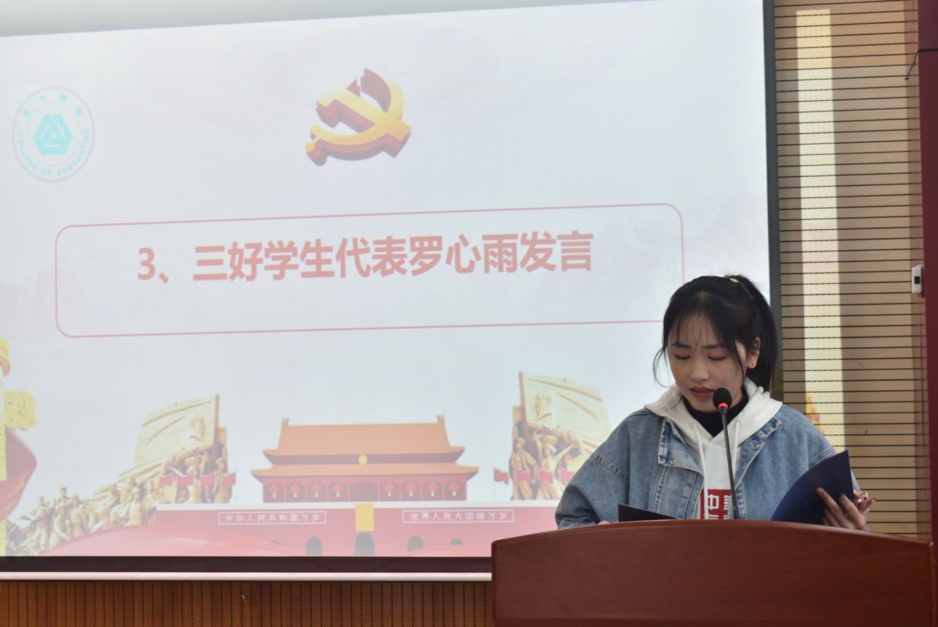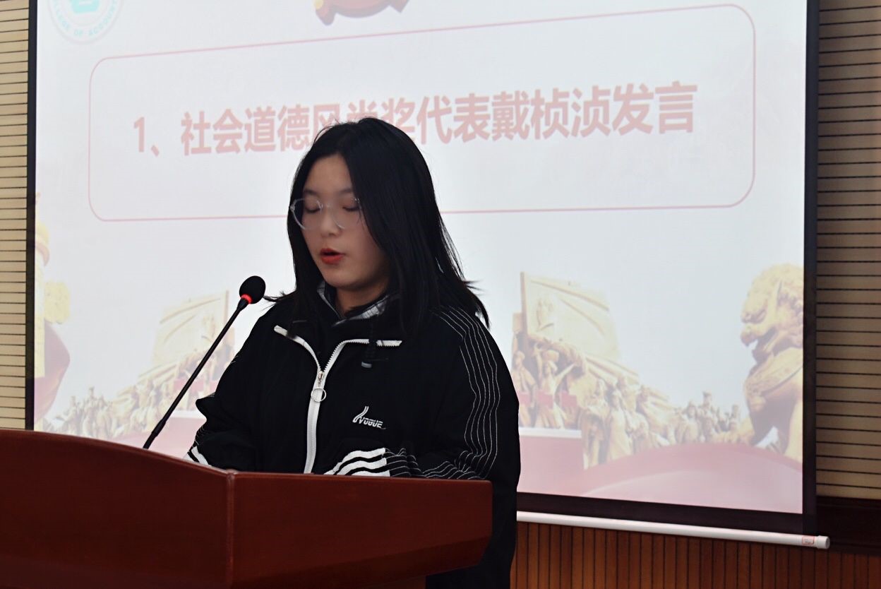 道德风尚奖代表戴桢浈同学分享了两点参与实践的心得:一是向道德模范学习,时时处处以道德模范为榜样;二是积极参加志愿服务活动,在实践中感受善的力量。德育标兵代表彭佳同学、三好学生代表罗心雨同学、优秀班干部代表姚再明同学3人都谈到,大学生要积极参加活动,丰富自身阅历;向模范学习,汲取正能量;立足当下,扎实学好专业知识,以过硬的综合素质勇敢肩负起当代大学生的使命和责任。