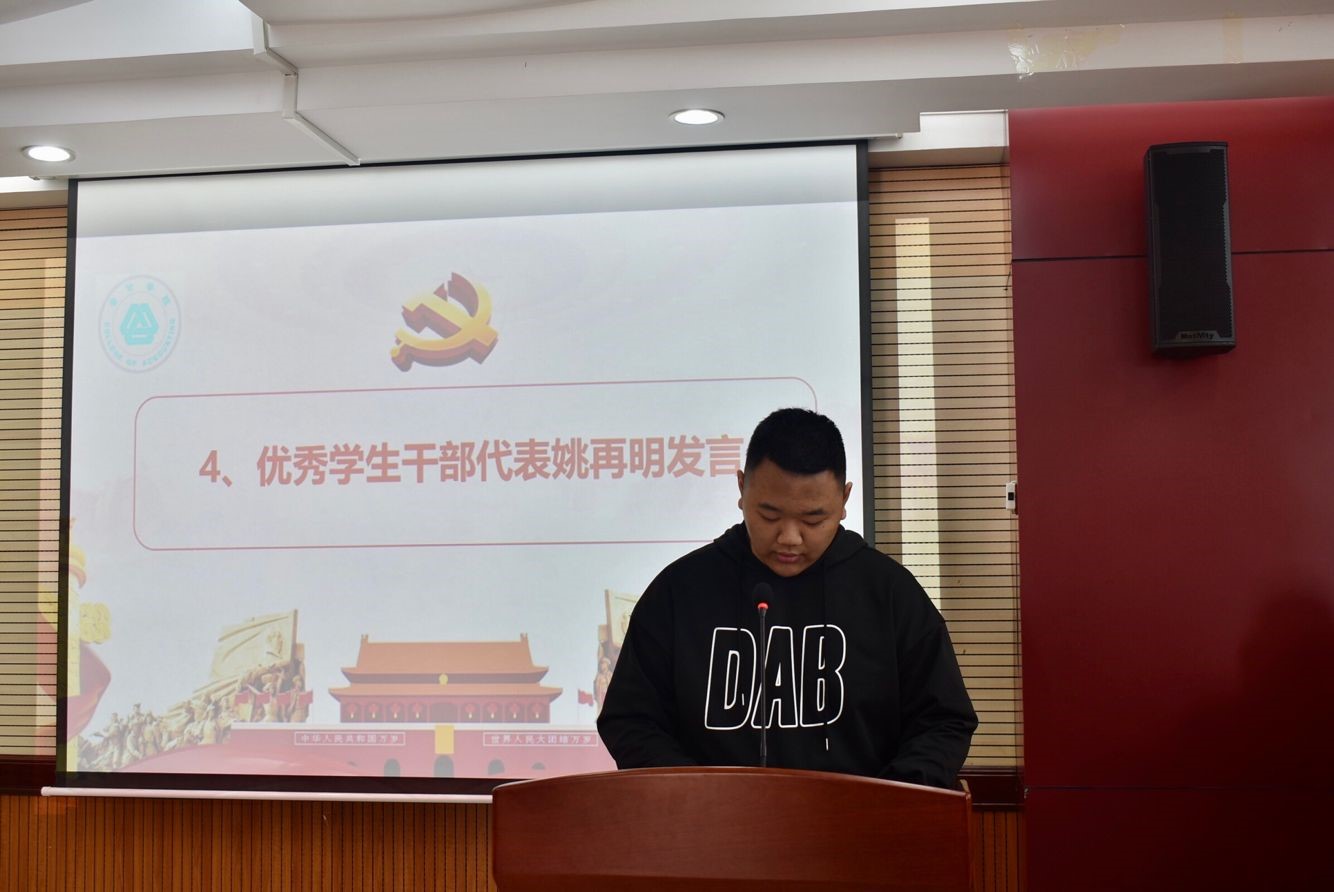 黄铖书记首先深度阐述了“德”的本质含义,认为“德”是大学生的品行品质、行为准则和道德规范,并指出,“立德树人”是我们应当遵守的行为准则。同时,他提出几点希望:一是坚定理想信念,励志为成人、成才、成功打下夯实的专业基础;二是希望同学们对标榜样、争做榜样,汲取正能量,营造良好的互促互进的学习氛围;三是希望获奖的同学戒骄戒躁,继续努力,以实际行动担负起这一份荣誉。