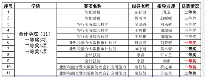其中,由李磊和李娜老师指导的会计技能团队、廖妍娇和薛之骞老师指导的业财税融合暨大数据管理会计应用能力团队以及钟彩霞和彭梦雅老师指导的业财税融合大数据审计技能团队均获省一等奖。