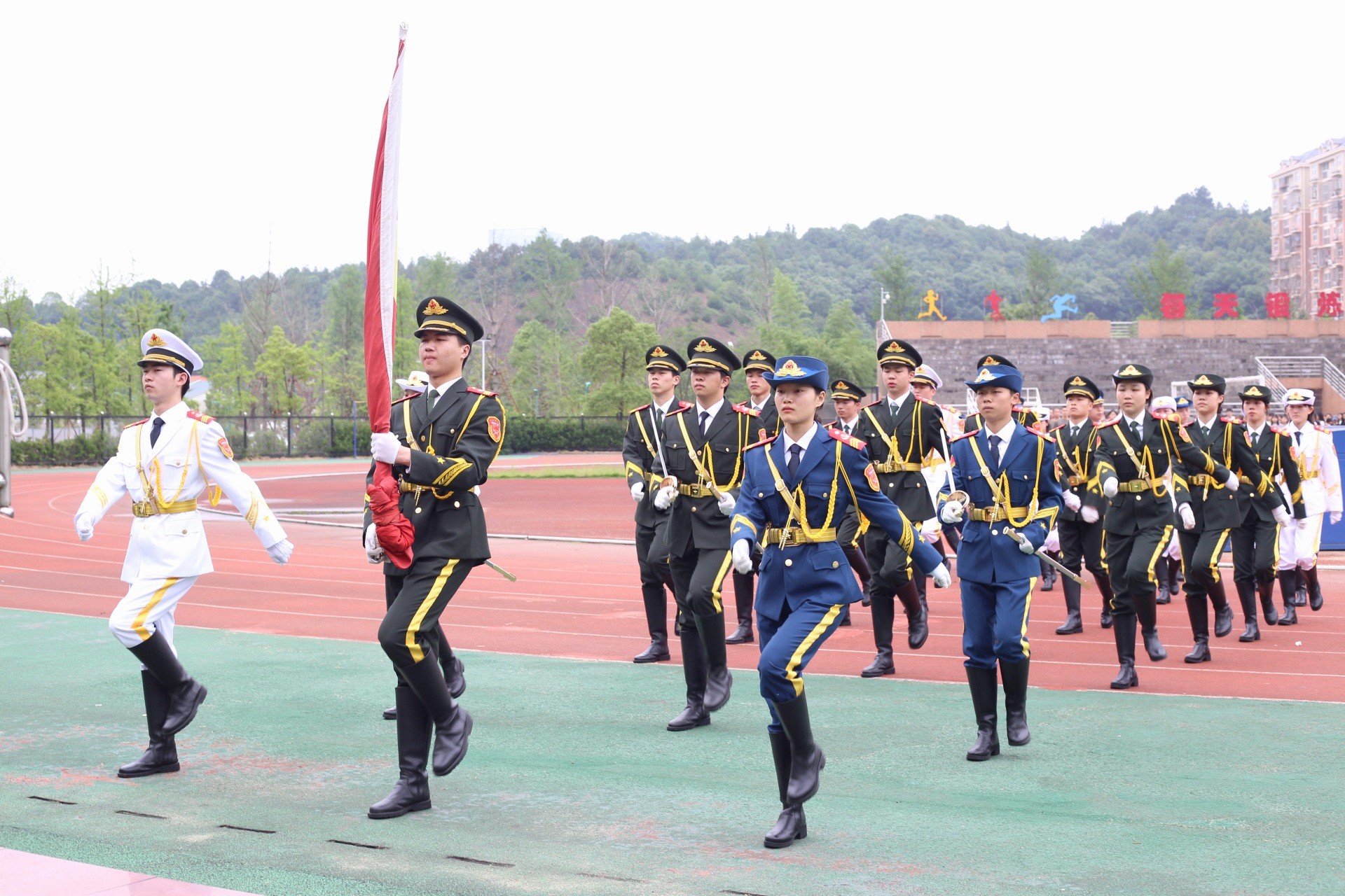 5月31日7:00,会计学院在田径场举行第二次升旗仪式。同学们在各班站队地点排列着整齐的队伍,等待仪式开始。