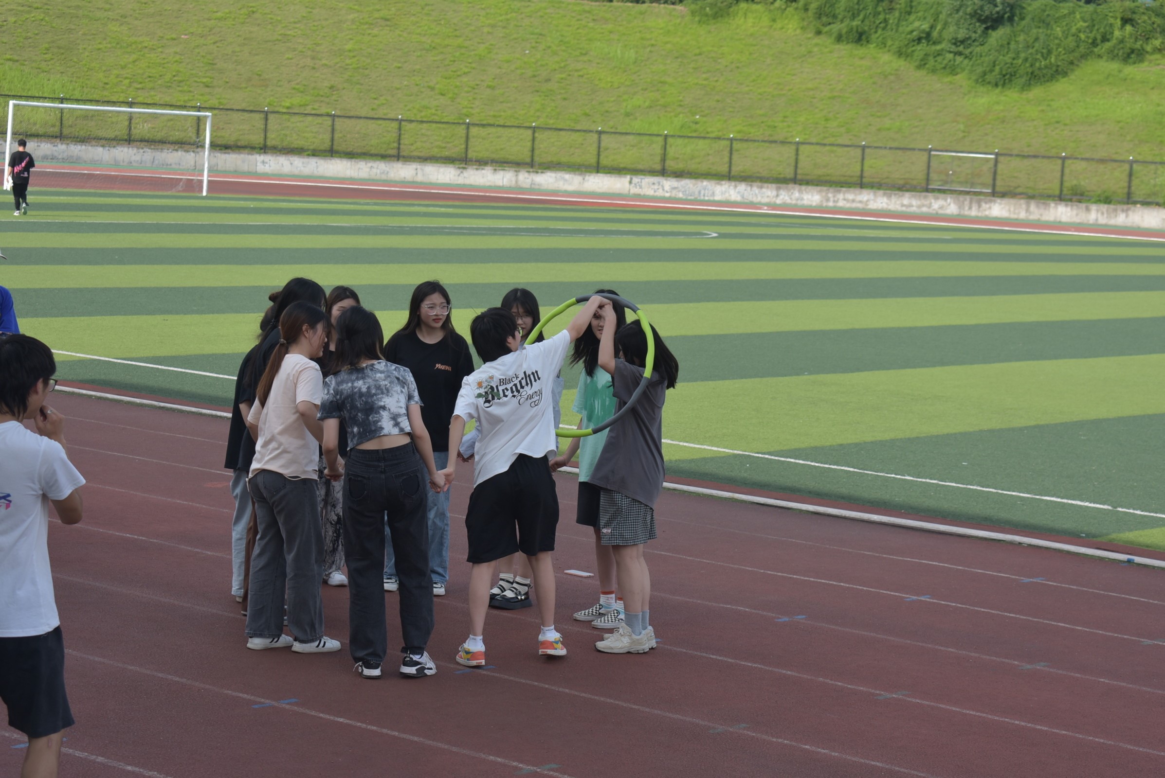 每组成员手拉手围成一个封闭的圆圈,在其中一人手臂上套上一个呼啦圈,比赛开始时,各小组同时运动,在不许用手的情况下,把呼啦圈穿过每个人的身体,最后传一圈,最先完成的一组胜出。