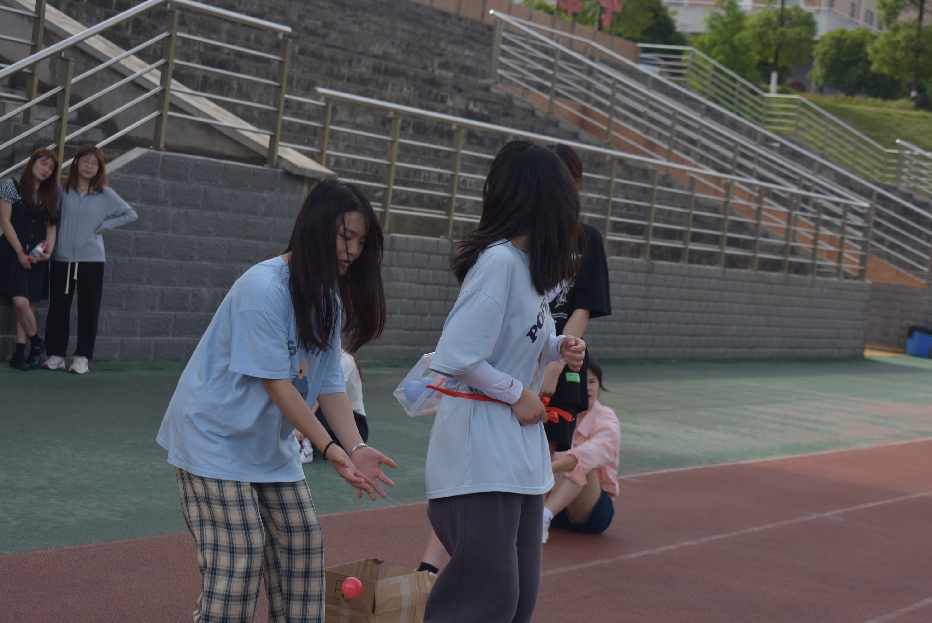 每组派出两人作为代表,一名队员腰上绑紧盒子,每个盒子里装10个乒乓球,音乐响起,队员开始扭动,另一名队员负责接球。音乐停止以接住乒乓球数多的组获胜。