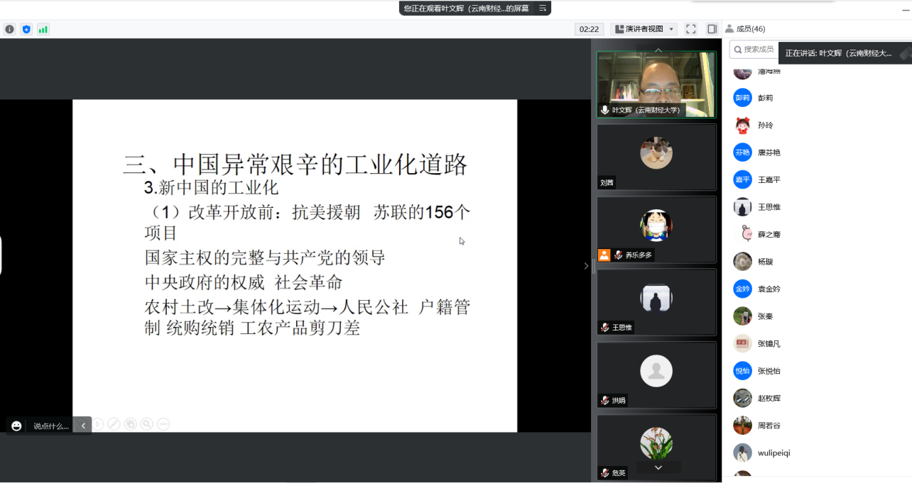 叶文辉教授以“工业化历史”为线索,围绕“主要国家的工业化道路”“中国异常艰辛的工业化道路”“中国崛起后的双循环经济格局”三个角度回答和阐释了国民经济学的角度下中国完整工业体系的建成与演变。