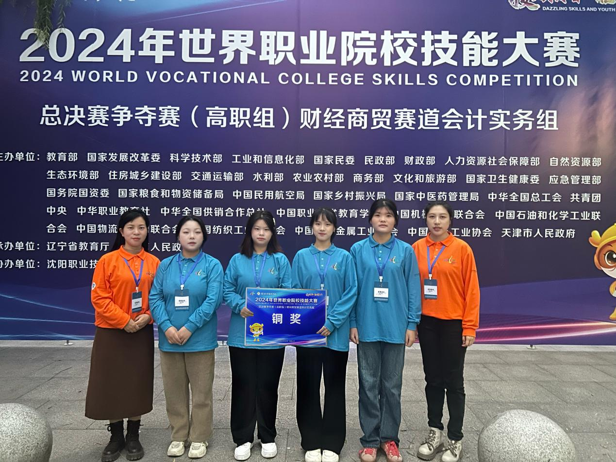 2024 年 10 月 26 日,世界职业院校技能大赛总决赛争夺赛(高职组)财经商贸赛道会计实务组大赛开幕式于沈阳盛大启幕。在此后的三日时光里,来自国内外的 64 支代表队、200多名选手齐聚赛场,展开了一场激烈的技艺较量。最终,在周若谷老师与张悦怡老师的悉心指导下,湖南商务职业技术学院代表队的李翩翩、左紫萱、姚亚玲、罗智慧四位同学凭借作品《税智守:金税四期初创企业税务合规核查预警项目》脱颖而出,荣获铜奖。
