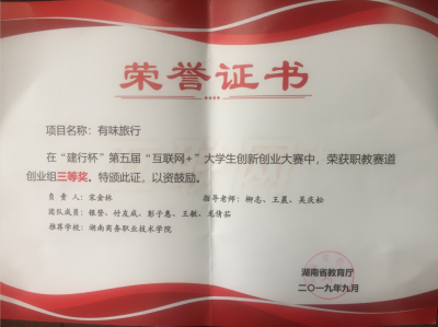 2019年10月,由我院学生何书慧、唐伽泺、刘成组成的参赛团队在指导老师徐志刚、刘梦洁的带领下,荣获2019年湖南黄炎培职业教育奖创业规划大赛三等奖…【查看全文】