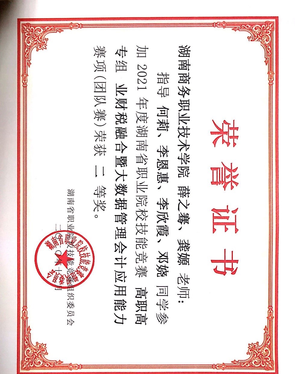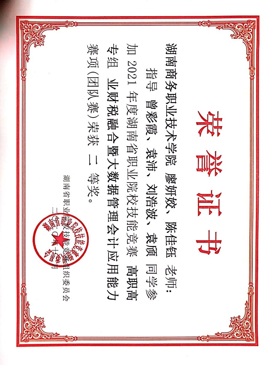2020年12月,在2021年湖南省职业院校技能竞赛(业财税管理会计)赛项中,我院共派出两队参赛,均荣获二等奖。分别为廖妍姣、陈佳钰、薛之骞、龚嫄老师指导的,由会计学院18统会1班袁颀、 18财管1班曾彩霞、18财管3班袁沛、19会计8班刘浩波组成的参赛团队;由薛之骞、龚嫄老师指导的,由会计学19财管2班李欣霞、19会计4班邓娆、18会计2班何莉、18财管4班李恩惠组成的参赛团队。
