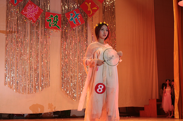 在骄阳音乐社团的歌曲演唱后,比赛正式开始。比赛分为两轮,第一轮由女模特身穿环保设计作品与男伴进行走秀,自信大方的走秀表演,纷纷展现了他们独特新颖的创意。作品的风格各有千秋。要求作品使用二次利用的废料,其目的在于向同学们传达环保精神。各具特色的作品和男女模特间别出心裁的互动让在坐评委及观赛同学大饱眼福。第二轮由女模特单独走秀展现作品,并由设计者在旁解说,讲述设计理念与作品宗旨,让同学们更直观地了解环保设计。最后由子茗茶社、书法社的表演谢幕。