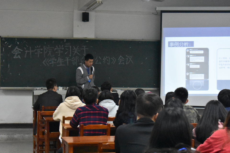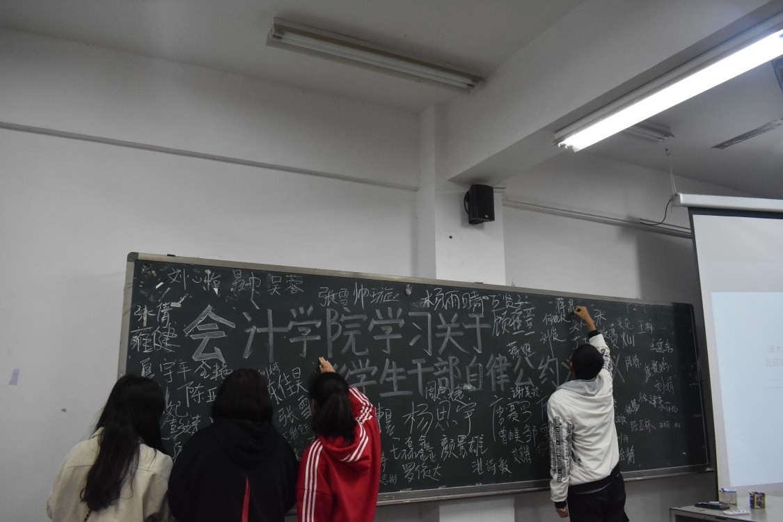 学习学生会干自律公约,针对于学校功利化、庸俗化的现象进行讨论并通过PPT展示现象;针对于讨论出来的现象以及PPT展现出来的问题,提出解决办法,制定相应的制度;接着在会计学院主席唐悦带领第十五届团学分会全体学生会干部进行公约集体宣誓;最后全体学生会干部参与倡议签字仪式。
