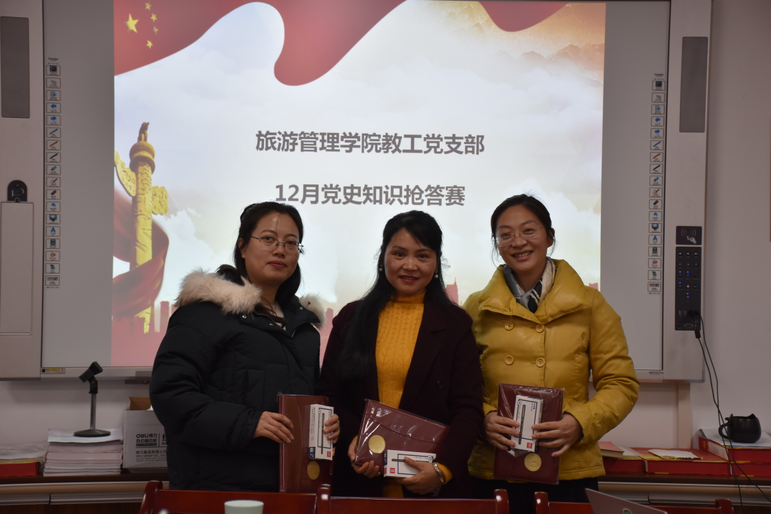 在建党100周年之际,为了歌颂党的伟大征程,守护党的初心,渲染比学赶超的学习氛围。旅游管理学院教工党支部于12月14日14:00,在办公楼207举行了主题为“重温光辉历程,传承红色基因”主题党日系列活动之二——党史知识抢答赛。