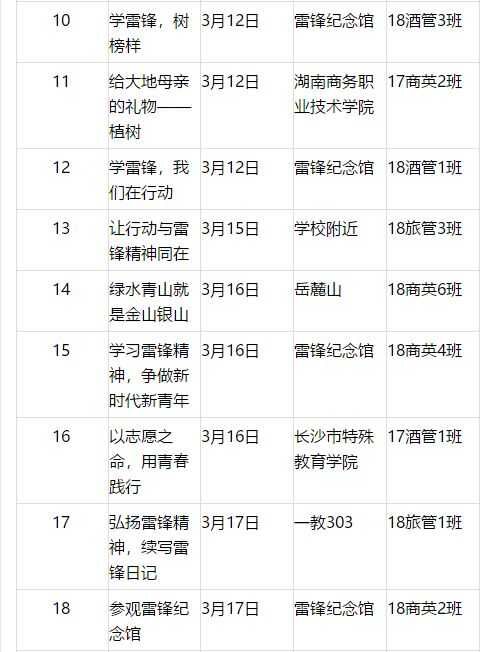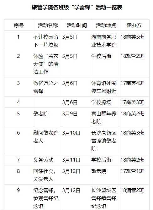 院部、系部部门、旅管学院各班级及学工党支部‘学雷锋’活动览表