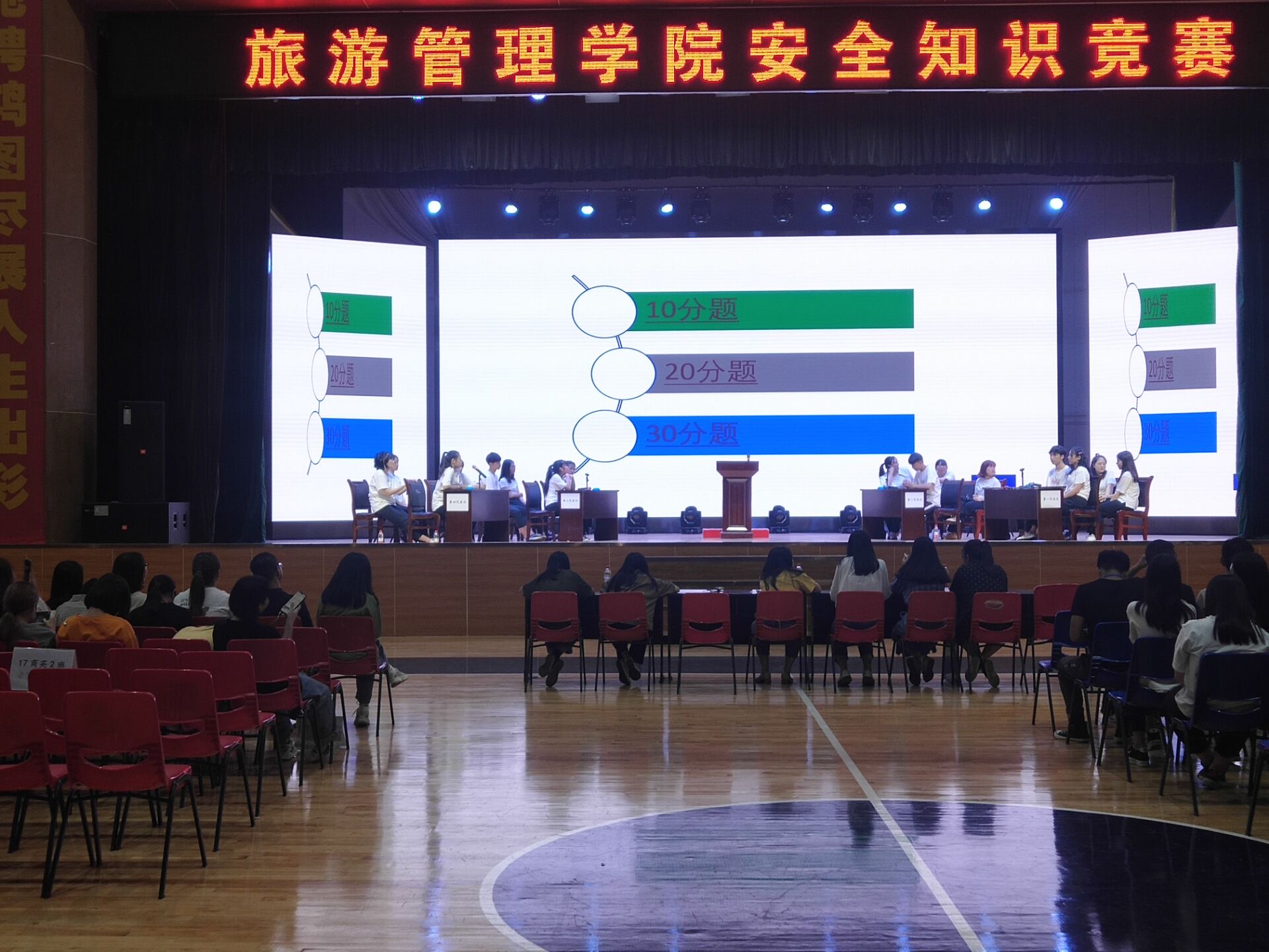 为了让同学们树立安全思想,加强安全防范意识,提高自我保护能力,2019年5月29日晚19:30,由湖南商务职业技术学院主办、旅游管理学院治保部承办的安全知识竞赛在体育馆内成功举办。