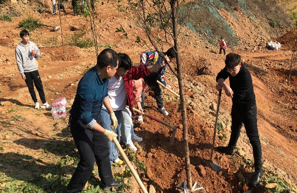 活动中,大家分工明确,齐心协力,教师党员与同学们共同协作完成树苗的栽种,呈现出一派热火朝天的劳动场面。