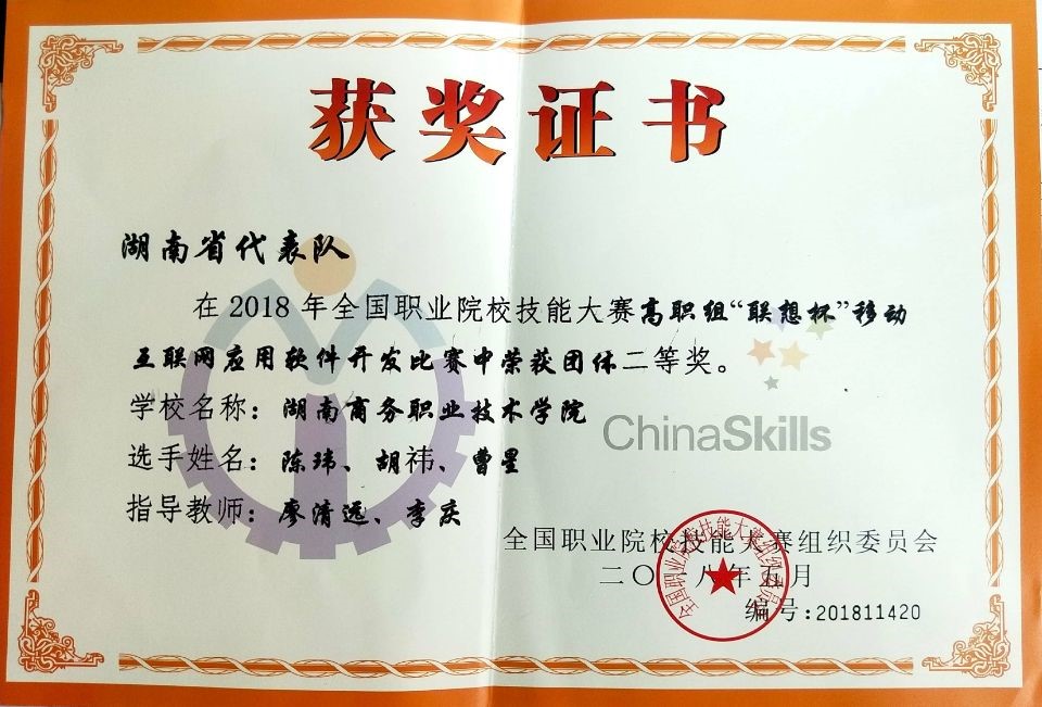 2018年全国职业技能大赛“移动互联网应用软件开发”赛项于5月21日在南京工业职院拉开帷幕。由我院软件专业廖清远、李庆两位指导教师,15软件4班曹星,16软件4班陈玮、胡祎三位学生组成的代表队在来自全国95所高职院校285名参赛选手的激烈比拼中,沉着应战,不畏强手,最终以总分第15名的优异成绩荣获团体二等奖。