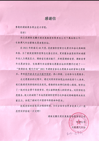 2021年的春运,因人口流动频繁,防疫工作突增压力,我院19软件4班学生刘星宇得知情况后,勇担使命,主动参与“情满旅途,暖冬行动”2021年湖南省春运志愿服务站的雷锋志愿服务,为返乡农民工、青年学子等提供防疫知识,做好宣传、秩序维护、咨询引导等志愿服务,全力辅助一线工作人员,为安全春运和温暖春节护航。