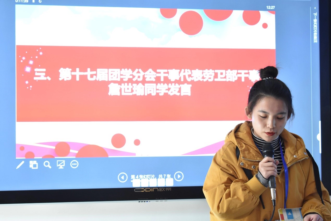 大会开始,由第十七届团学分会主席团代表谭艳娟对本学期的各部门工作任务完成情况以及取得的成绩进行了汇报。而后,由第十七届团学分会干事代表劳卫部干事詹世瑜表示进入团学分会以来自己收获了不少成长和温暖,希望和大家一起在新的一年里继续拼搏,继续奉献。