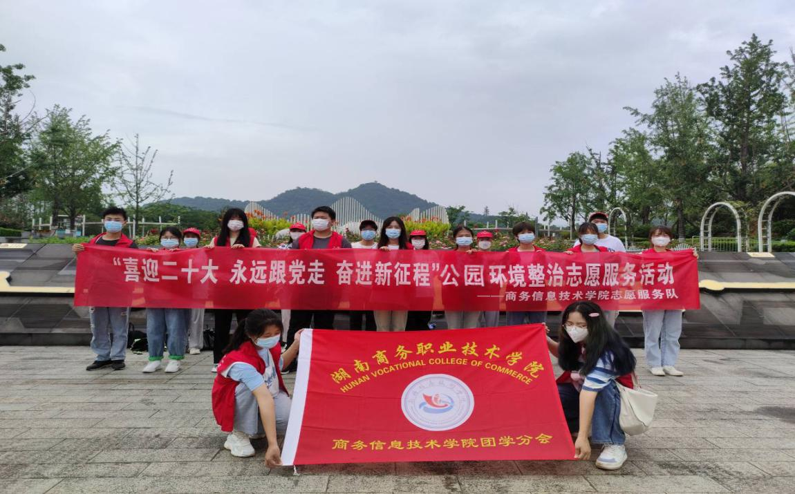 (通讯员 黄婕)随着“六五”环境日的到来,为构建清洁美丽的公园环境,提升公园的和谐文明与人文气质,并展示我院青年志愿者的志愿服务精神。商务信息技术学院于2022年6月18日早上8点开展“喜迎二十大 永远跟党走 奋进新征程”公园环境整治志愿服务活动。