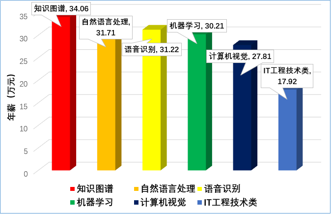 AI各细分领域的招聘量也逐年攀升,而且薪资比IT技术岗位要高上许多。根据猎聘的数据,2019年以来公开发布的招聘岗位中,IT工程技术类的平均年薪为17.92万,而AI领域知识图谱方向的最高年薪可达43.42万,其平均年薪也高达34.06万,接近IT工程技术类的两倍。而AI 细分领域中,除了知识图谱,平均年薪较高的依次是自然语言处理、语音识别、机器学习和计算机视觉。