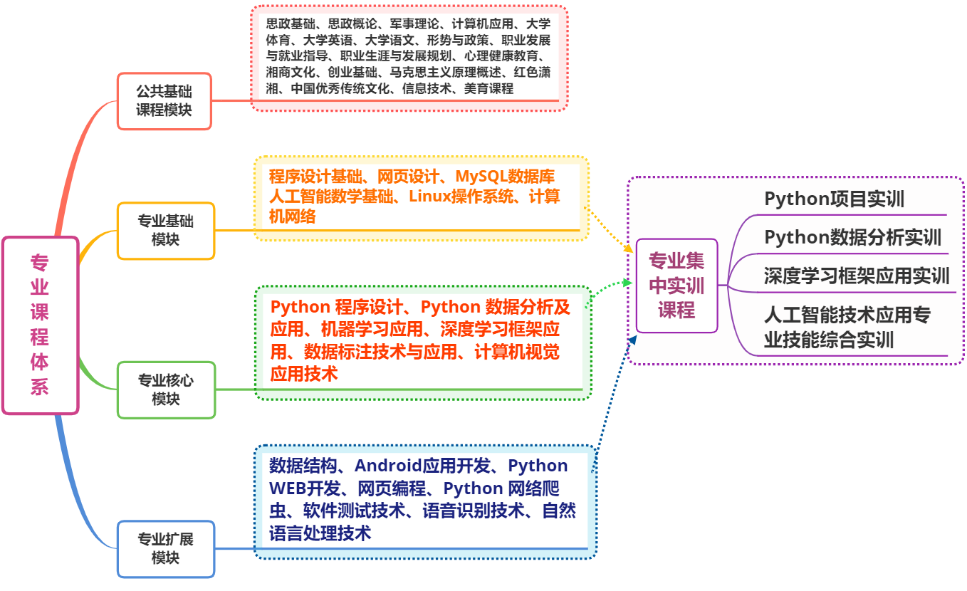 课程分为五个模块:公共基础课程模块、专业基础课程模块、专业核心课程模块、专业能力拓展选修课程模块、专业集中实训模块。具体如下图所示。