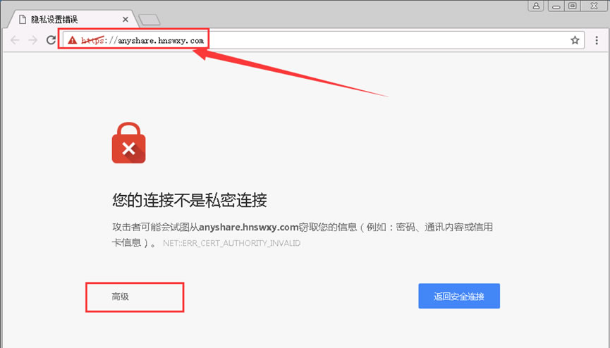 1.首先打开浏览器(最好使用Google Chrome浏览器),在浏览器地址栏内输入以下地址:https://anyshare.hnswxy.com(注意是“https”,而不是“http”)。单击“高级”,如下图所示: