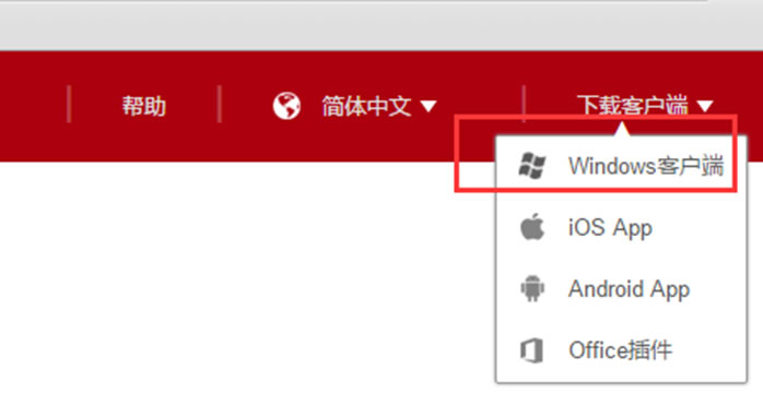 2.在anyshare.hnswxy.com网站的右上侧,有“下载客户端”的链接,当把鼠标上去的时候,会自动弹出如下图所示的下拉菜单,单击“Windows客户端”下载并安装。也可根据需要下载其他类型的客户端。
