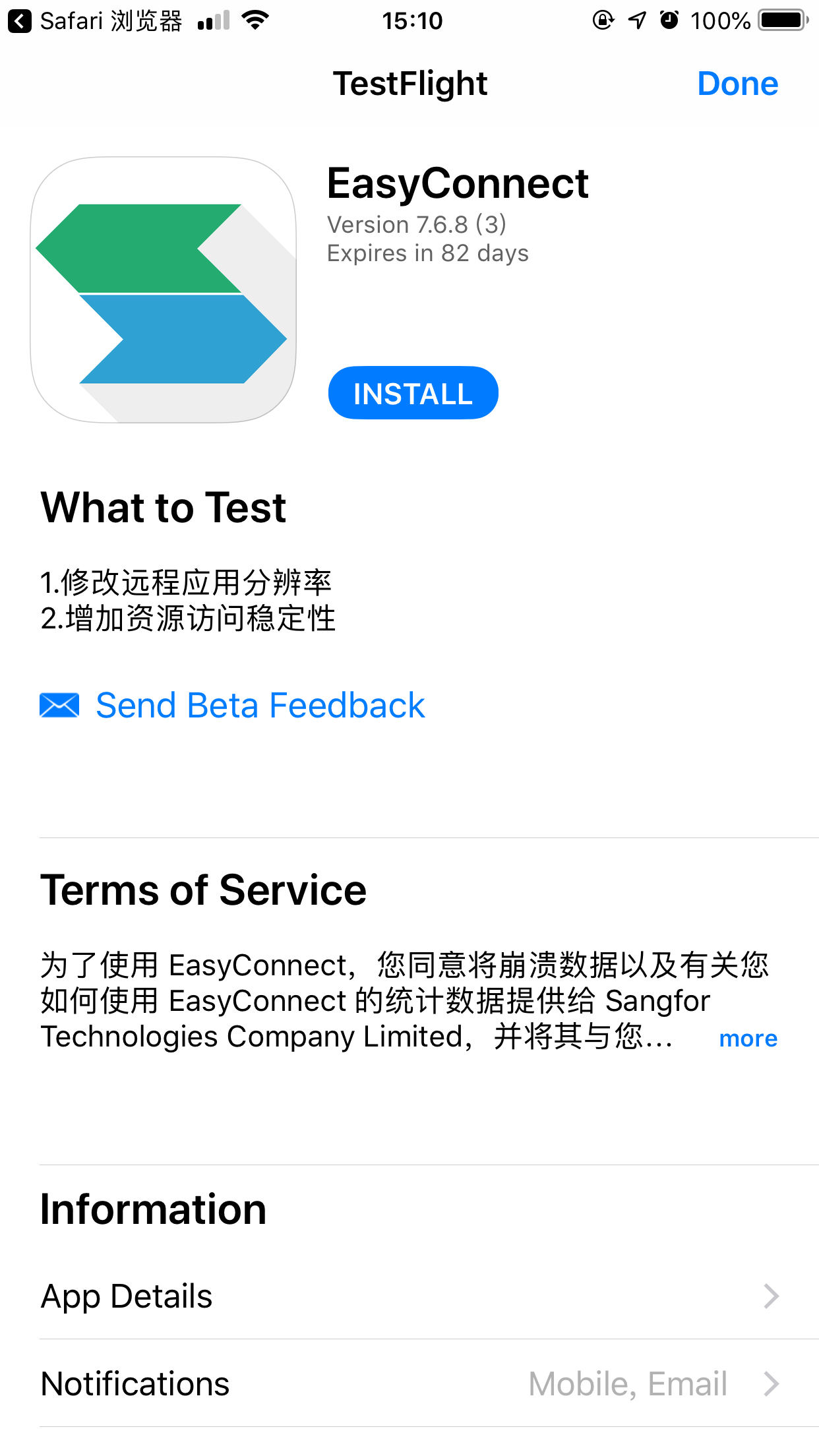 5. 安装testflight完成之后,再回到safari,进行第2步,点击开始测试,会跳到testflight中去: