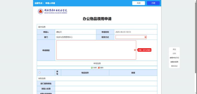 办公物品领用申请表单页面