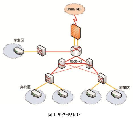学校校园网络分为办公区、家属区和学生区3个主要区域,如图1所示。其中办公区使用IPoE方式认证,家属区使用PPPOE认证方式,两个区域的网关均为华为ME60。学生区使用802.1X认证。