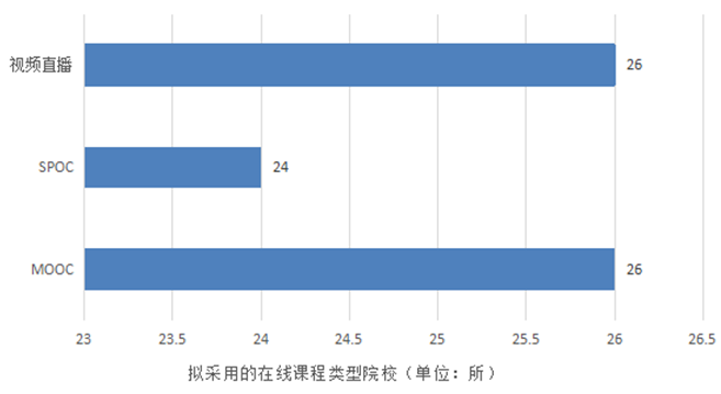 高校拟采用的在线课程类型如图6所示,大部分高校均采用了MOOC、SPOC、视频直播这三种课程类型组合教学模式。其中选择MOOC平台的高校占比达87%,选择视频直播的高校也达87%,选择SPOC的高校占比为80%。