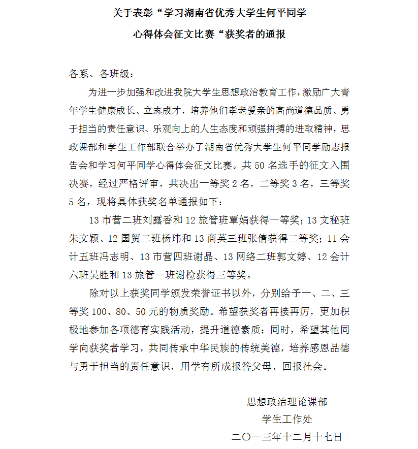 为进一步加强和改进我院大学生思想政治教育工作,激励广大青年学生健康成长、立志成才,培养他们孝老爱亲的高尚道德品质、勇于担当的责任意识、乐观向上的人生态度和顽强拼搏的进取精神,思政课部和学生工作部联合举办了湖南省优秀大学生何平同学励志报告会和学习何平同学心得体会征文比赛。