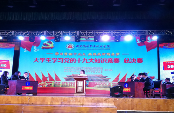 为在全校范围内掀起全面学习党的十九大精神的热潮,贯彻落实习近平总书记系列重要讲话精神和治国理政新理念新思想新战略,进一步激发大学生对思想政治理论学习的积极性,2017年12月26日晚7点,我校在体育馆内组织开展了“学习贯彻十九大 同心共筑商务梦”知识抢答赛活动。本次比赛由思想政治理论课部、宣传统战部、校团委联合举办。校党委书记周忠新、副院长廖良林和思政课部、宣传部、学工处、校团委负责人,以及各二级学院党总支书记到场观赛。