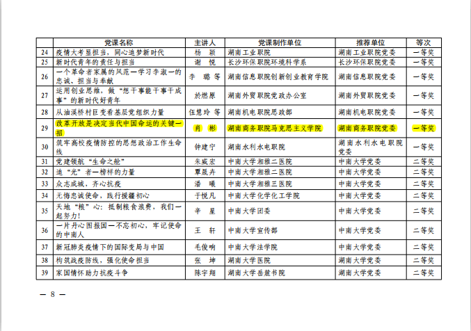 为深入学习贯彻习近平新时代中国特色社会主义思想,进一步巩固拓展 “不忘初心、牢记使命”主题教育成果,湖南省教育工委在全省开展了“党课开讲啦”优秀党课展示竞赛活动。马克思主义学院肖彬老师的党课《改革开放是决定当代中国命运的关键一招》获得全省一等奖。