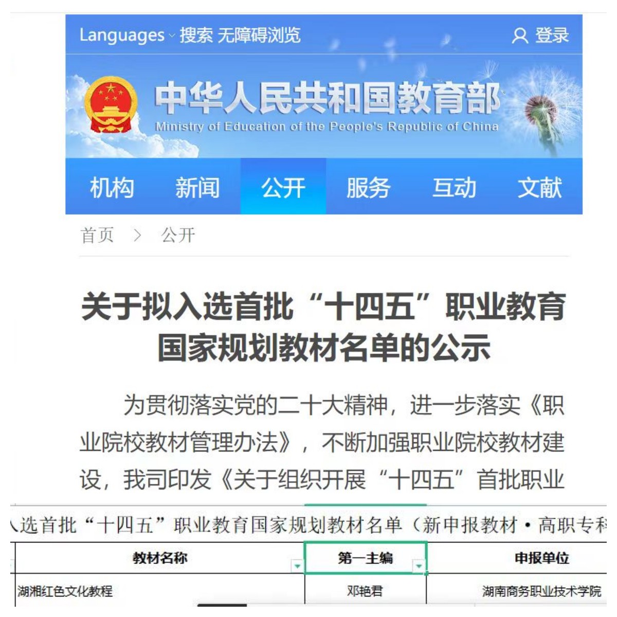 近日,教育部职业教育与成人教育司发布《关于拟入选首批“十四五”职业教育国家规划教材名单的公示》,马克思主义学院院长邓艳君教授领衔主编的《湖湘红色文化教程》成功入选,这是湖南商务职业技术学院马克思主义学院将红色基因融入高职思政教育“五化融合”模式创新与实践的又一硕果。