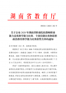 2020 年湖南省职业院校教师职业能力竞赛教学能力比赛、专业技能比赛和思想政治教育教学能力比赛省级决赛于 7 月至 11 月先后举行,日前教育厅公布了…【查看全文】