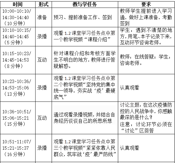 课前为实施有计划有步骤教学,特制定线上详细教学安排表,并提前发放给学生,使学生熟知教学安排,激发学生参与度、提高教学实效性。