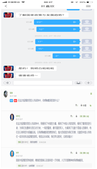 课后的教学由主讲教师和助教一起完成。一是进行个别辅导交流。对有疑问的学生,及时进行线下的答疑解惑。二是关注学习进度。通过学习通后台查看学生的学习动向,关注学生课后任务完成情况。三是跟踪网络舆情。通过“云”课堂跟踪学生对知识信息的意见,监控管理平台言论发表,判断学生舆情信息,了解学生的思想动态。