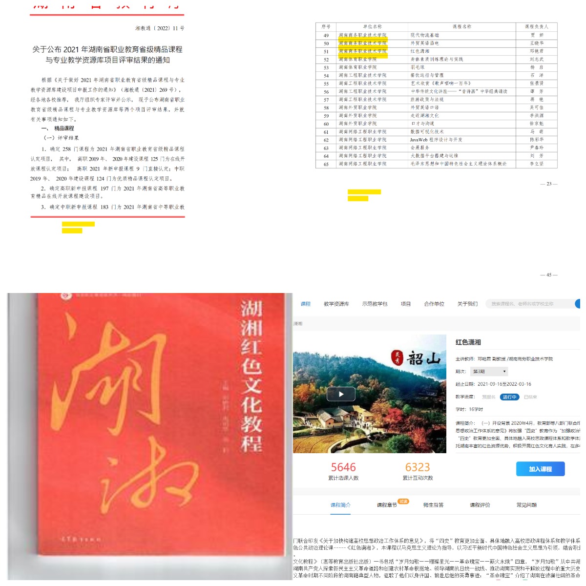 组建了一支由院长、课程带头人、骨干教师组成的“红色文化”课程建设团队,开发了《红色潇湘》特色思政课。课程以习近平新时代中国特色社会主义思想为指导,围绕“岁月如歌——璀璨星光——革命瑰宝——薪火永续”四个专题展开,主要介绍湖南共产党人探索新民主主义革命道路过程中的重大历史事件、不同革命阶段的典型人物、革命斗争中形成的珍贵文化遗产,以及湖南红色精神的主要内涵、时代体现和赓续传承,是引导大学生学史明理、学史增信、学史崇德、学史力行的重要渠道。课程团队公开出版《湖湘红色文化教程》(高等教育出版社),并依托超星学银在线同步建设了红色潇湘线上课程,立项为2021年湖南省精品在线开放课程建设项目。