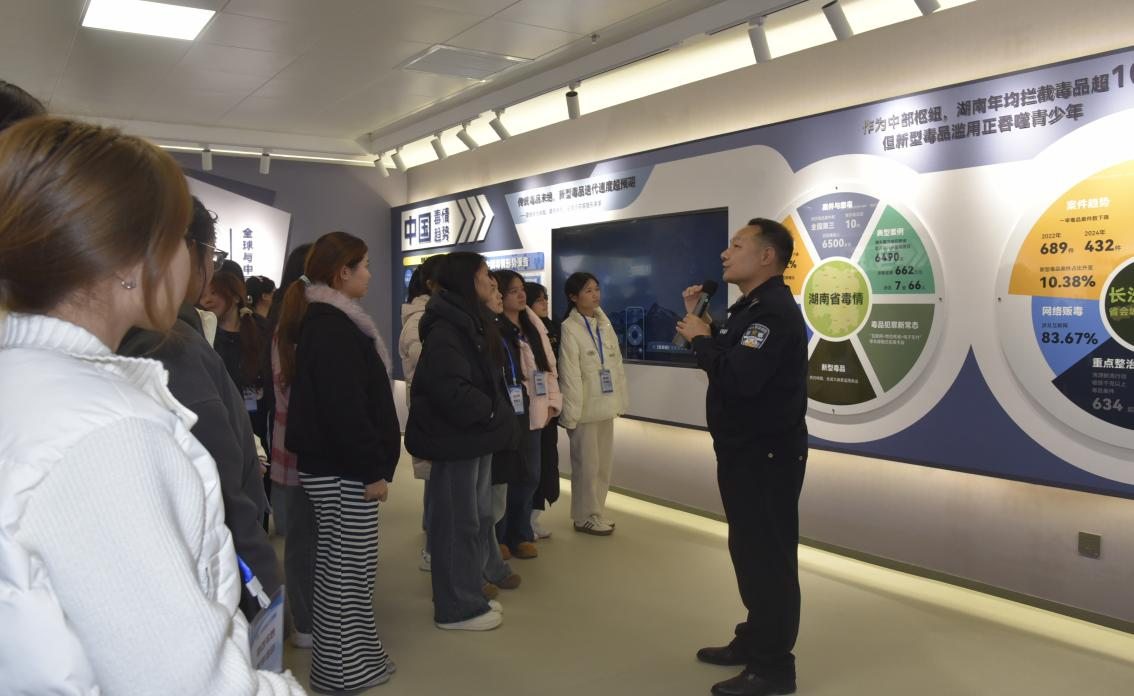 为筑牢青年学生禁毒思想防线,深化法治教育实践成效,12月16日,湖南商务职业技术学院主修《学法时习之——学习习近平法治思想》课程的30名学生,在马克思主义学院乔颍、冯霞等老师的带领下,走进湖南省麓山强制隔离戒毒所禁毒法治宣传教育展馆,开启了一场集知识性、互动性与警示性于一体的沉浸式学习之旅,真正把禁毒法治教育从课堂延伸到实景。