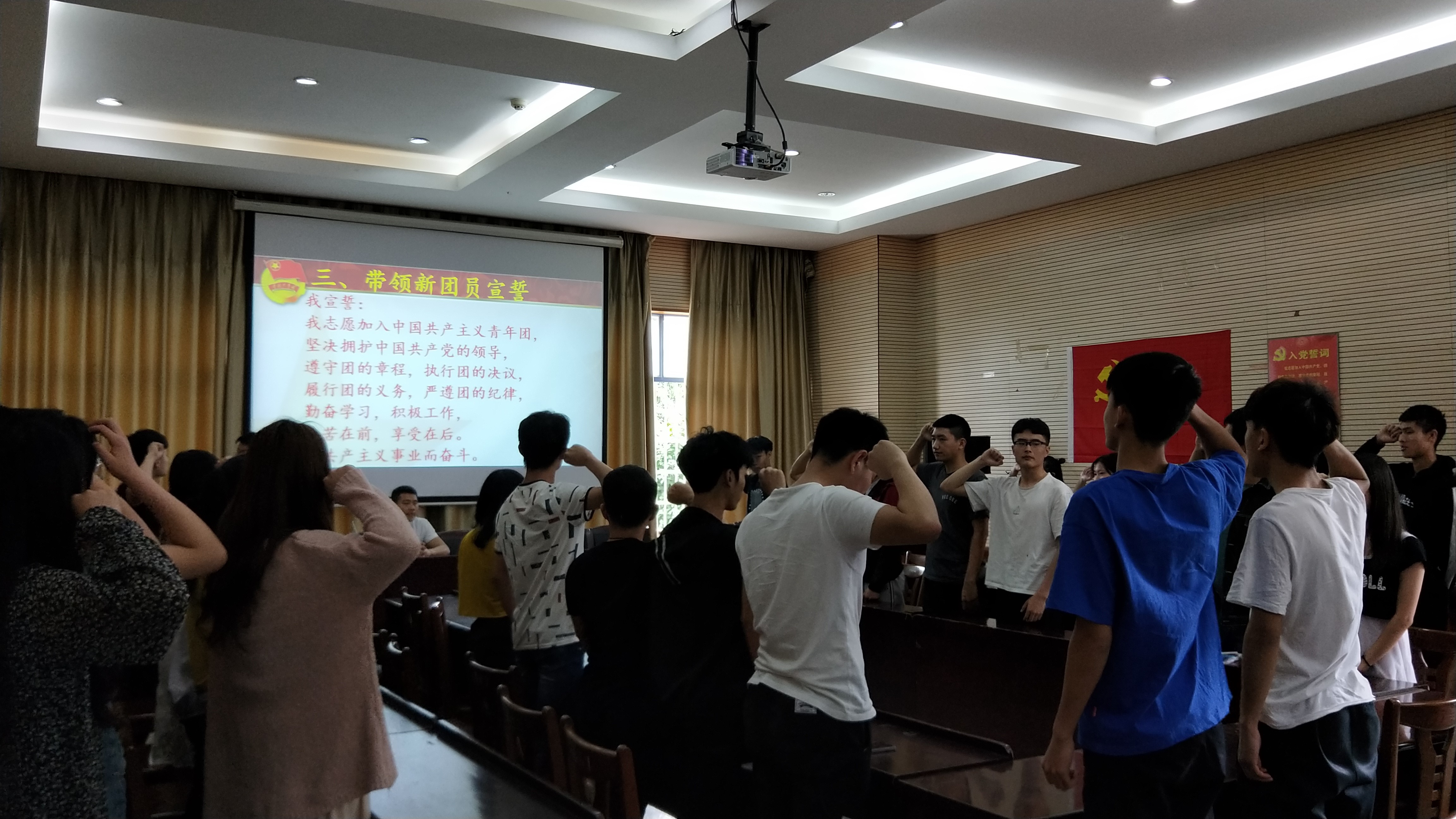 2018年上学期“入团宣誓仪式”于2018年5月4日星期四中午12:30在办公楼第五会议室举行。共有80名优秀的入团积极分子成为新团员,并参与了本次的入团宣誓仪式。此次会议邀请了院团学会主席兼副书记寻盈丰。