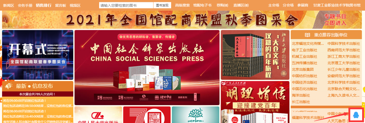 1、主会场:其左上角展示领导讲话及平台消息发布。其他板块主要展示重点出版社书目,直接点击出版社名称即可进入选书界面。