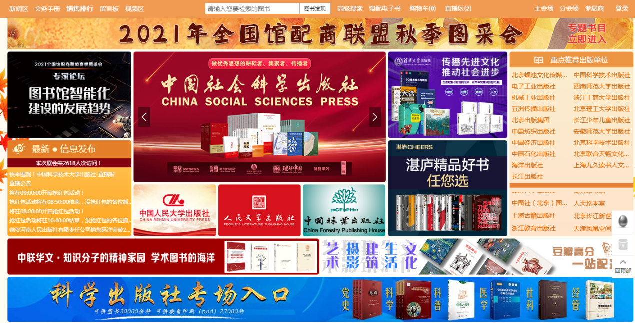 金秋时节,“云端”相约,2021全国馆配商联盟秋季线上图采会如约而至。为服务广大师生/读者,同时丰富我校/馆资源建设。现诚邀广大师生/读者参与本届图采会。2021全国馆配商联盟秋季图采会采用线上订购的模式,让广大师生/读者足不出户“云采书”,届时平台将展示百家出版单位全品种图书、二十余万种新书资源。更有出版社直播、红包雨等精彩活动等待大家参与。