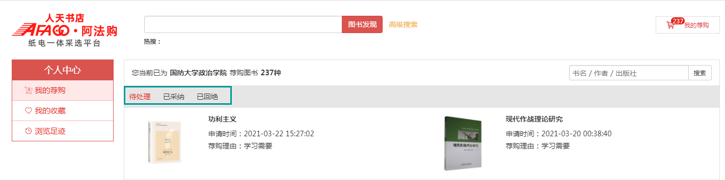 4、我的荐购:【个人中心】→【我的荐购】中可查看到所有的荐购书目,及图书馆的采纳情况。