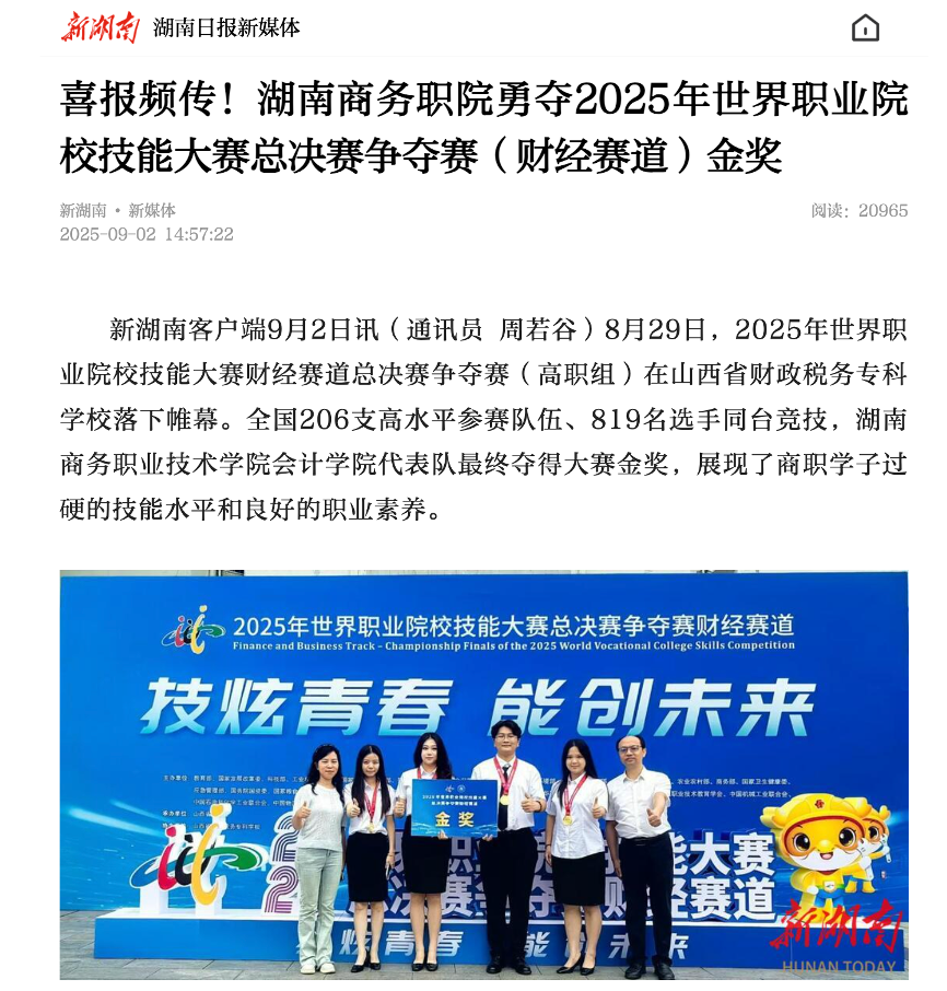 新湖南报道——喜报频传!湖南商务职院勇夺2025年世界职业院校技能大赛总决赛争夺赛(财经赛道)金奖