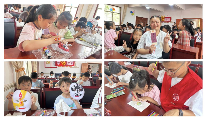 “爱向远山行”(安化分队)心理公益队邀请到岳峰村52位学生和村委、驻村干部以及学生家长参加。该心理公益活动设置了三大特色服务模块:“心理科普知识宣传加油站”“心理健康状况现场调查”和“大手牵小手绘画疗愈”。“心理科普知识宣传”由心理公益队发放心理健康宣传科普手册,回答心理健康科普知识十问。互动环节中,孩子们勇敢倾诉校园社交烦恼,家长们也提出教育困惑,公益队队友耐心解答。心理健康状况现场调研还邀请了学生和家长参与填写调查问卷,回收有效问卷67份,为后续持续跟进当地困境儿童心理状况提供了数据基础。“大手牵小手绘画疗愈”公益队志愿者们与小朋友们共同创作非遗脸谱,在绘画中体会自我,点亮心灯。